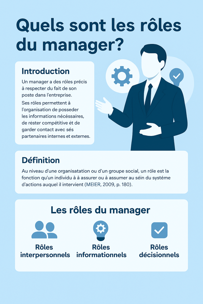 Au niveau d’une organisation ou d’un groupe social, un rôle est la fonction qu’un individu a à assurer ou à assumer au sein du système d’actions auquel il intervient (MEIER, 2009, p. 180). Appliquée au management, cette notion renvoie à l’ensemble des actions et responsabilités liées à la position du manager dans l’entreprise.